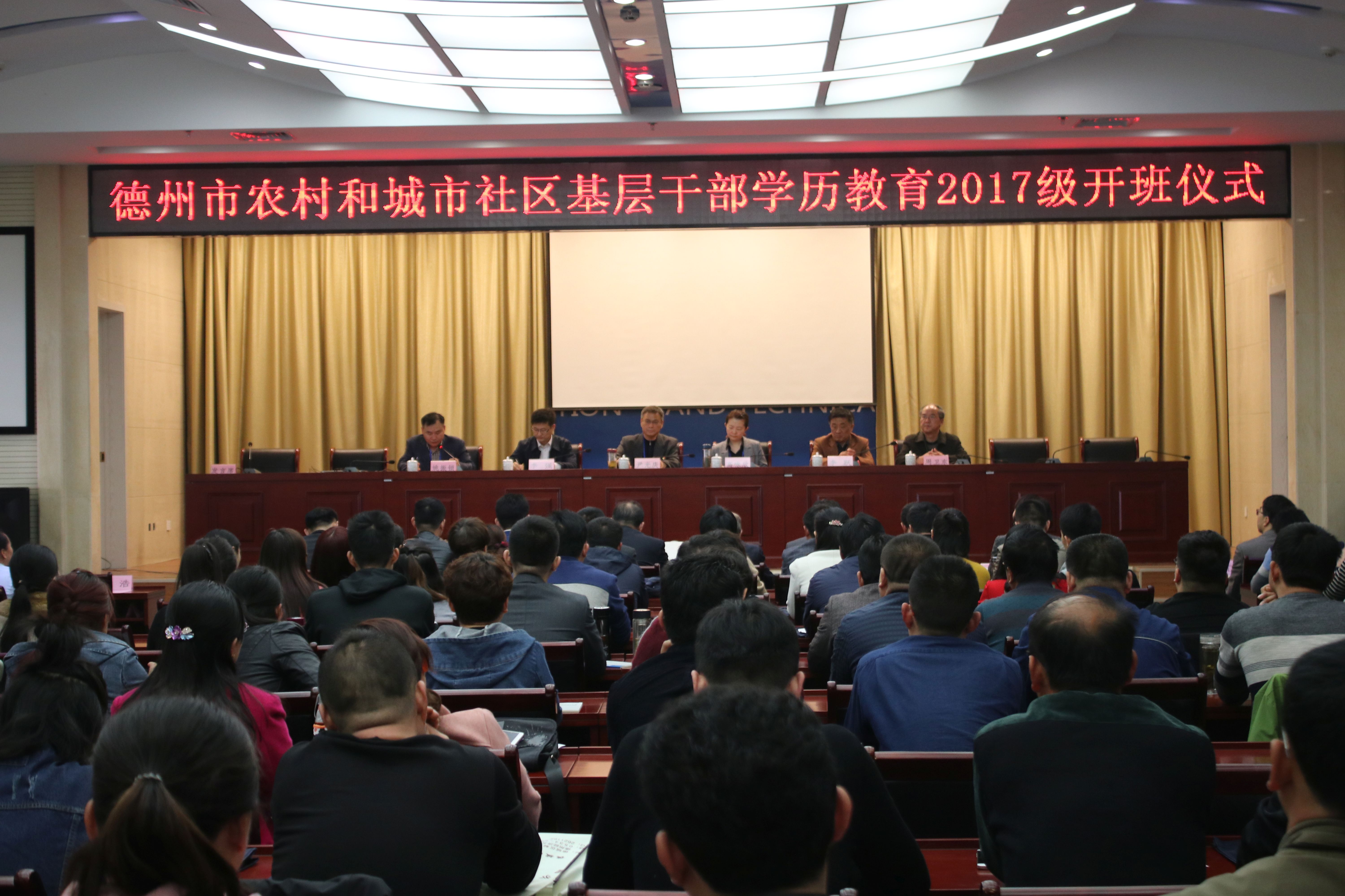 根据《关于做好2017级农村和城市社区“两委”成员专科学历教育开学有关工作的通知》(鲁远教字【2018】1号)要求,3月28日上午9:00德州市农村和城市社区基层干部学历教育集中开班仪式在beat365英国官网网站隆重举行。山东广播电视大学纪委书记尹光庆、山东省党员干部现代远程教育中心主任科员高咏欣、德州市党员干部现代远程教育中心副主任李强、beat365英国官网网站副书记副院长李跃、德州广播电视大学负责人以及德州市、齐河县、德城区、陵城区、德州经济技术开发区、市运河经济开发区组织部门党员干部教育部门负责人,县电大领导、市电大教学教务管理负责人,组织部派遣的临时党支部书记、班主任、课程教师以及德州市2017级农村和城市社区基层干部学历教育大专班的全体学员参加了典礼。