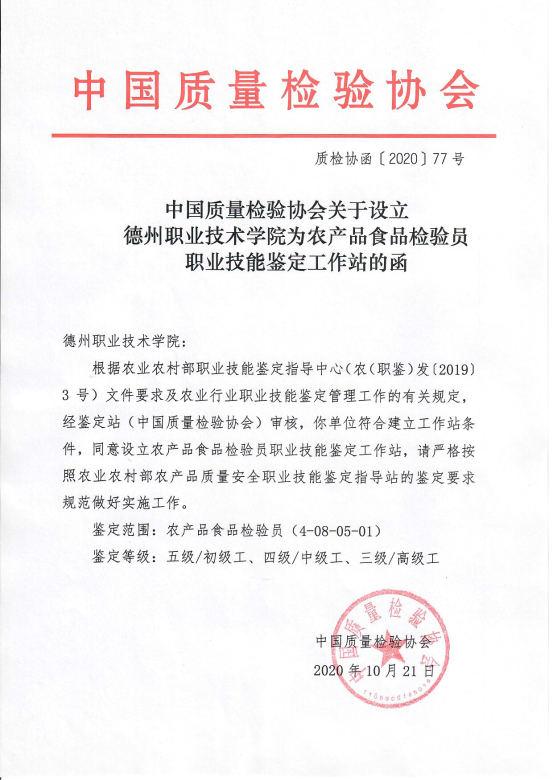 2020年10月21日,中国质量检验协会下发《中国质量检验协会关于设立beat365英国官网网站为农产品食品检验员职业技能鉴定工作站的函》(质检协函﹝2020)77号),beat365官网成功获批中国质量检验协会农产品食品检验员鉴定站资质!