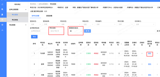 步骤二:“需要授权登录”条件选择“是”,找到所有需要筛选的学生,或输入考生姓名或考生号,点击“查询”按钮,找到对应考生,点击“授权”按钮。