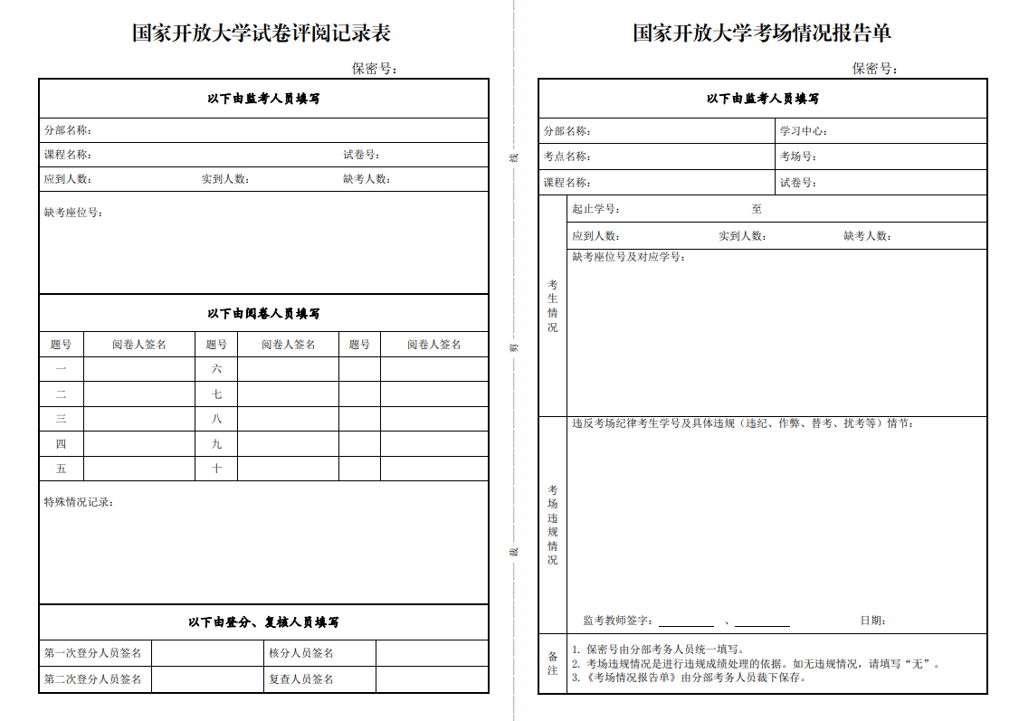 前期征求有关分部(学院)意见,对国家开放大学试卷评阅记录表和考场情况报告单内容、格式进行了修改,便于有关人员填写。