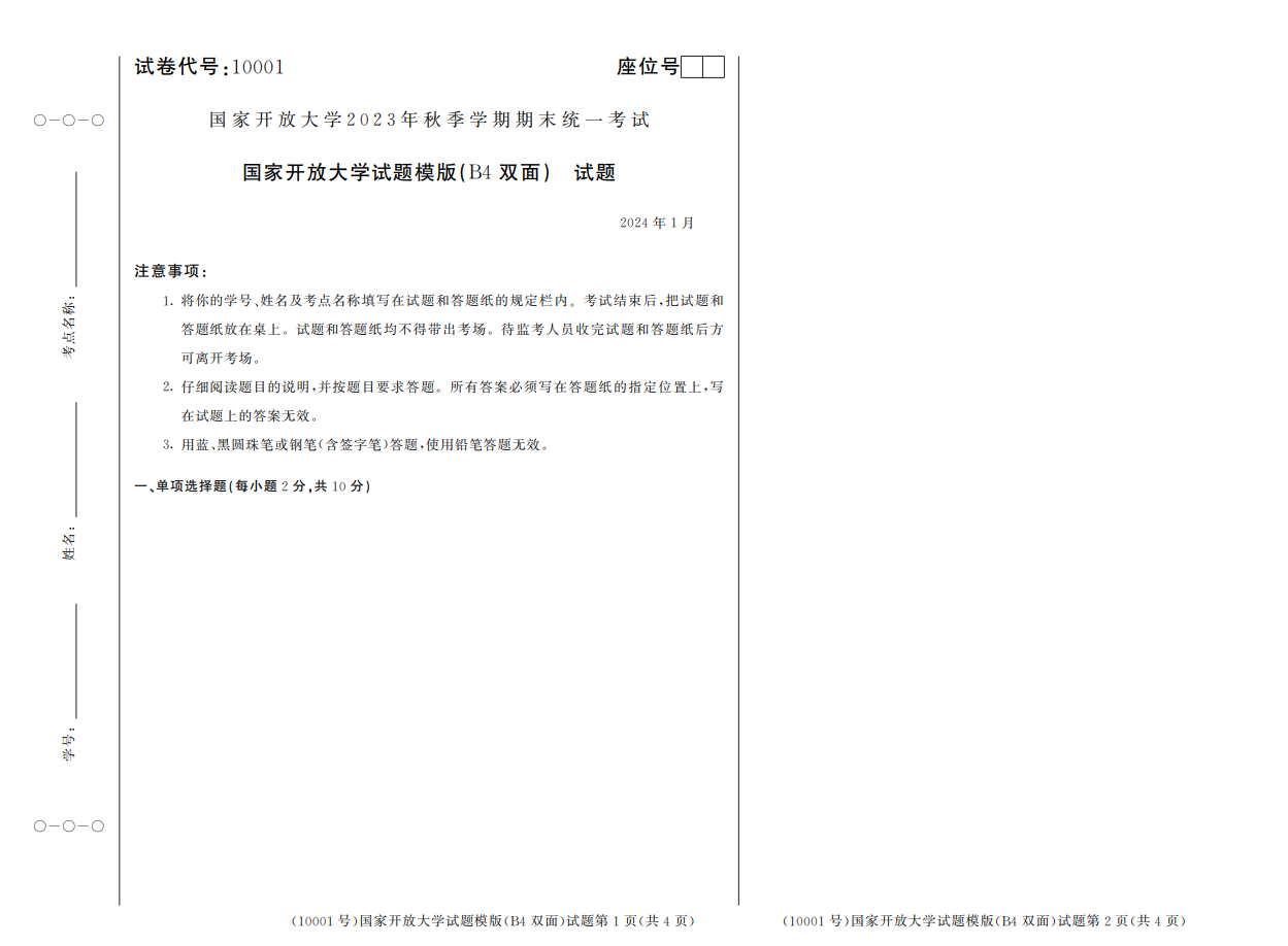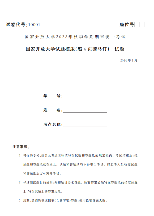试题内容4页以内的科目,试题纸使用B4纸单/双面印刷;超过4页的科目,使用B5纸印刷,骑马钉装订。