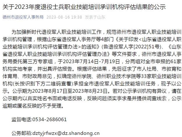 德州市退役军人事务局于2023年8月23日公示完毕,共有33家机构入选。beat365官网成功入选德州市退役军人技能培训承训机构。