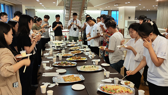 第一晚参观试验场后,大家乘坐校车回到学校,大阪工业大学的老师和同学们为大家精心准备一场欢迎晚宴,位于16层的空中餐厅可以将大阪夜景尽收眼底,可口的寿司,脆嫩的烤鸡,绵密的布丁…全自助的用餐方式让双方同学得到更充分的交流互动。